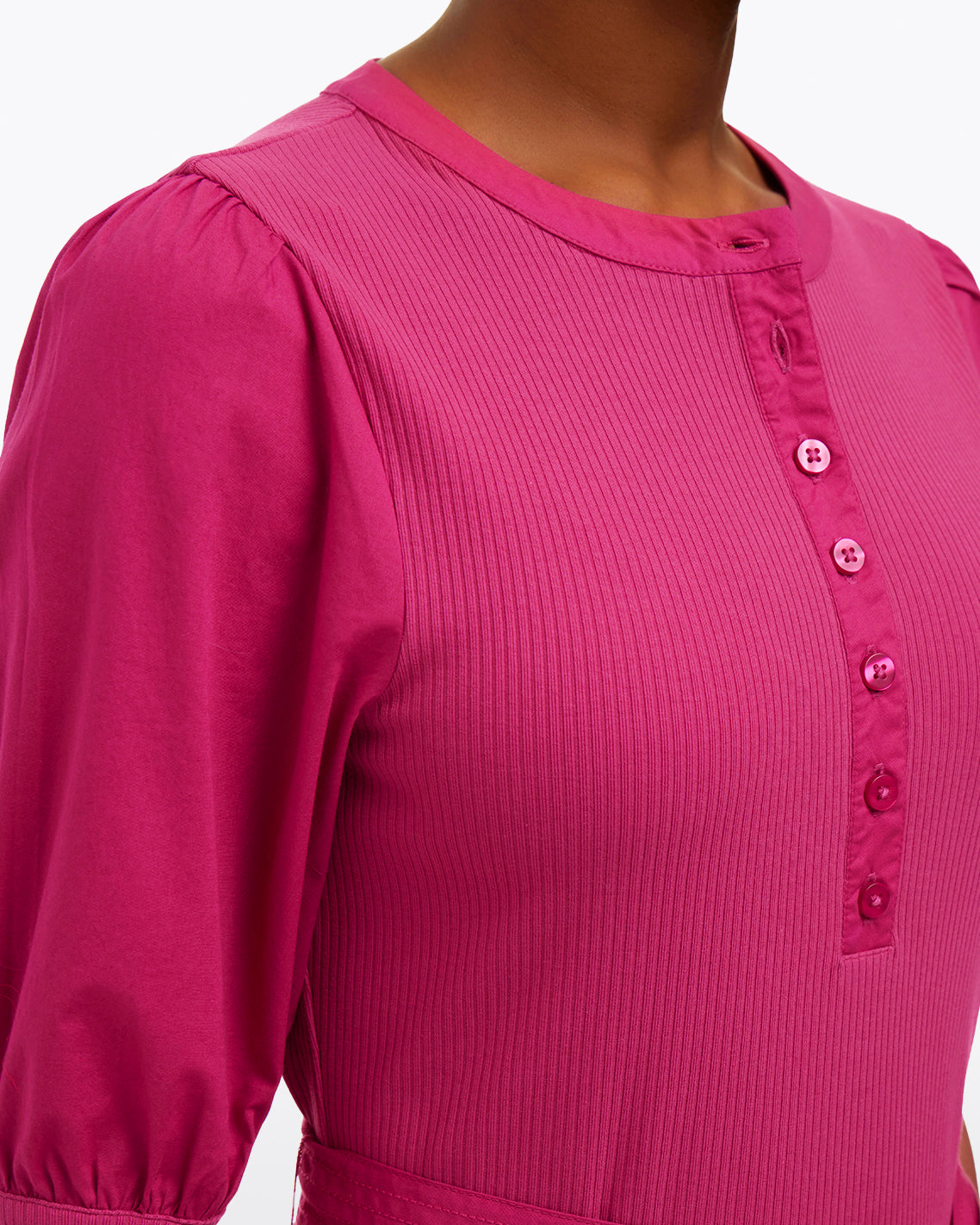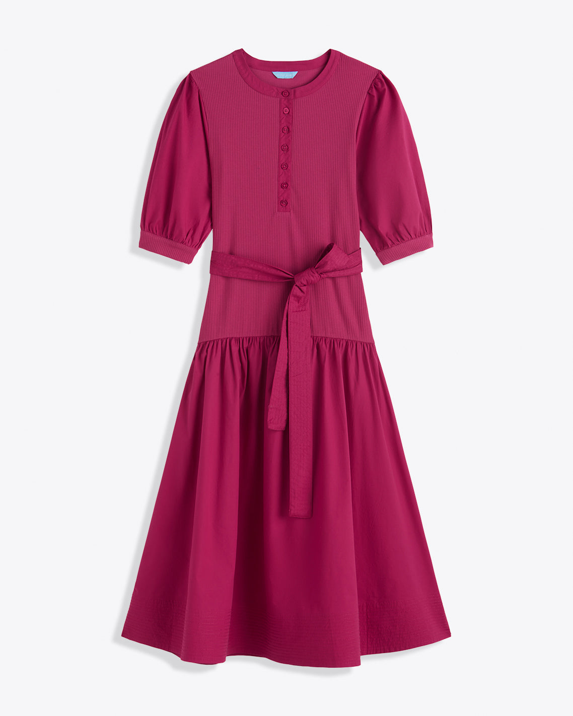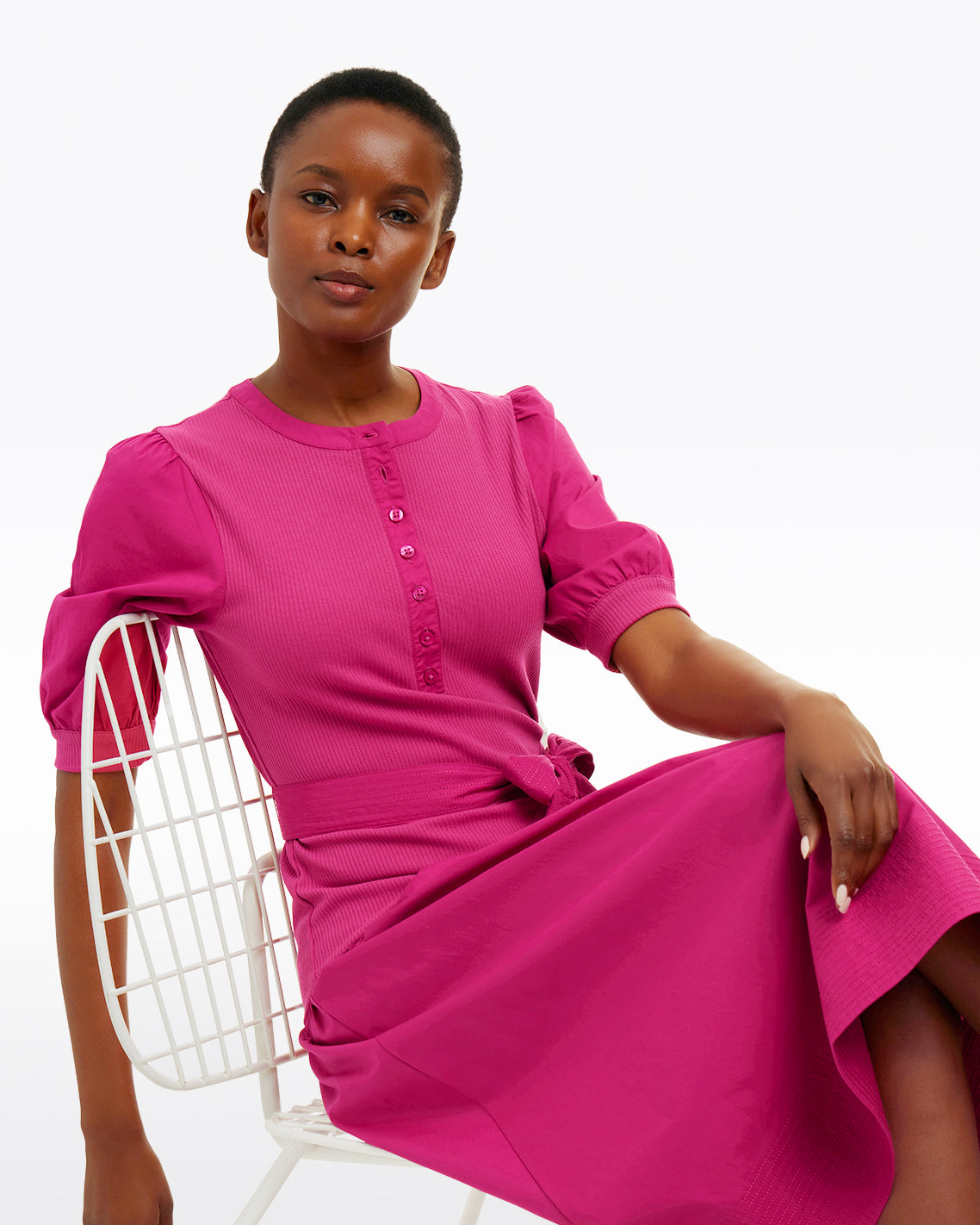 Mix things up. Our Celeste Mixed Media Dress in Raspberry Pink is constructed from a cotton-blend knit and a poplin with the perfect amount of stretch, for a comfortable, flattering fit. Finishing touches include center-front buttons and a self belt. Wear this with high heels or sandals, to parties, dinners out, even the office.