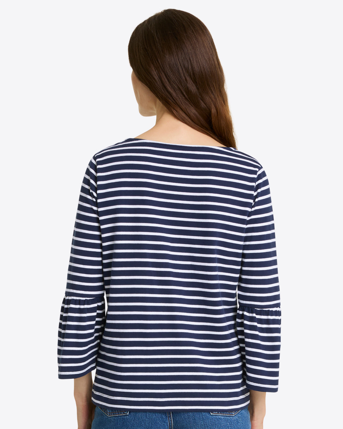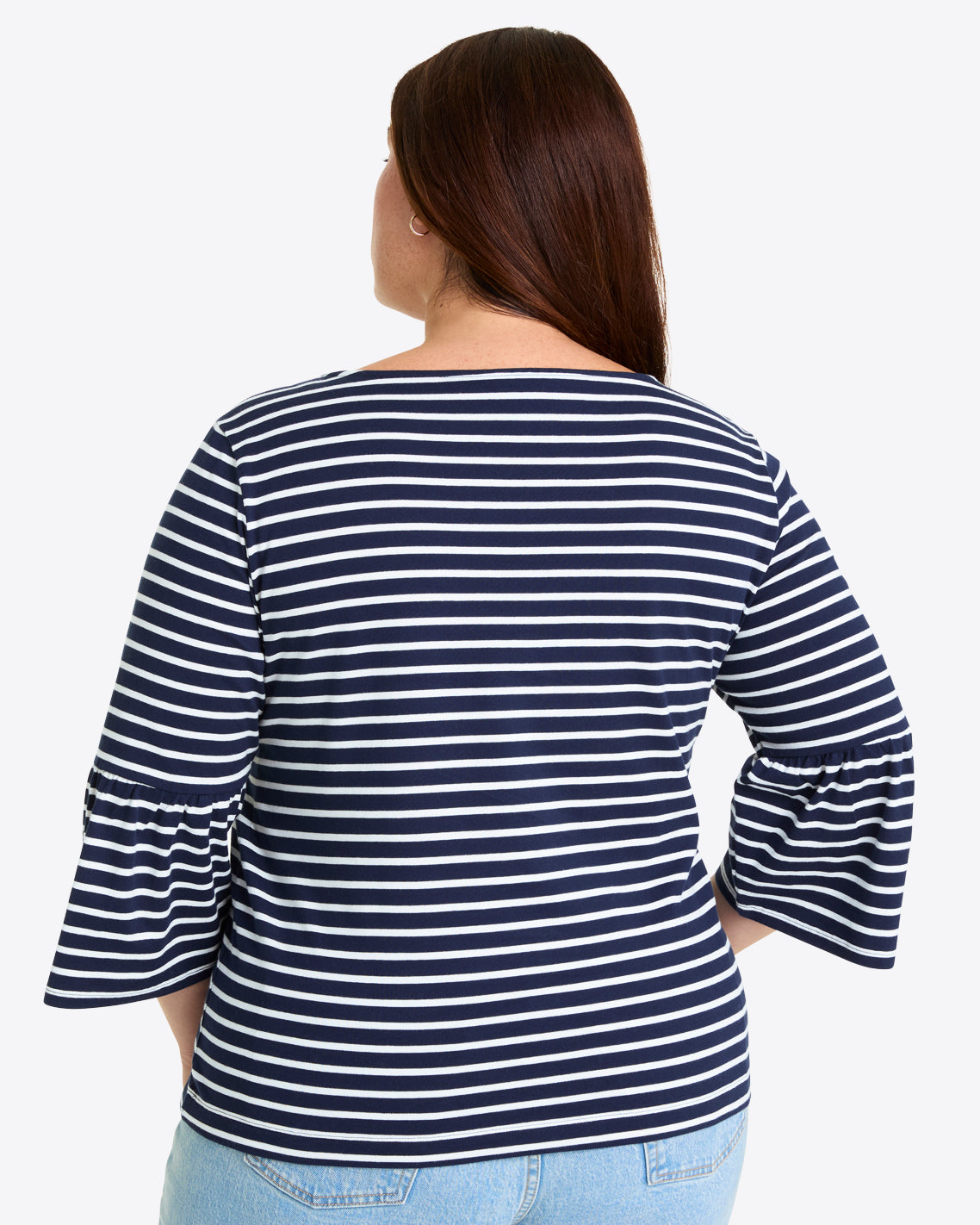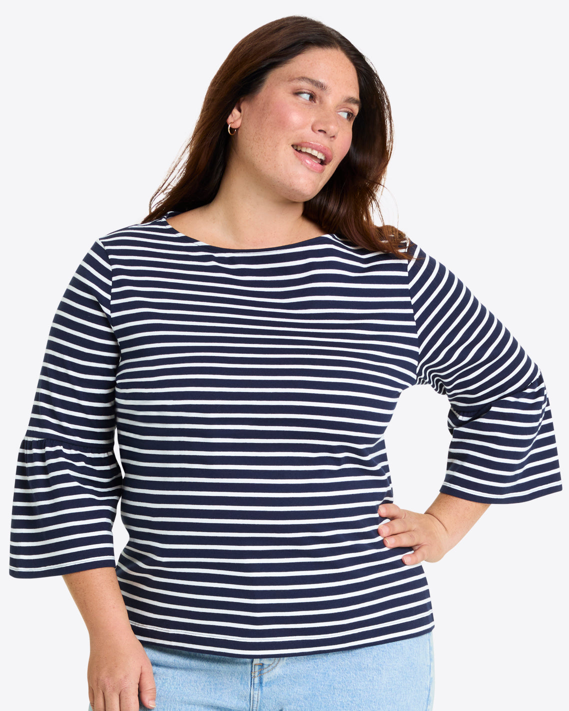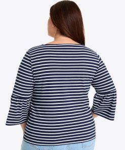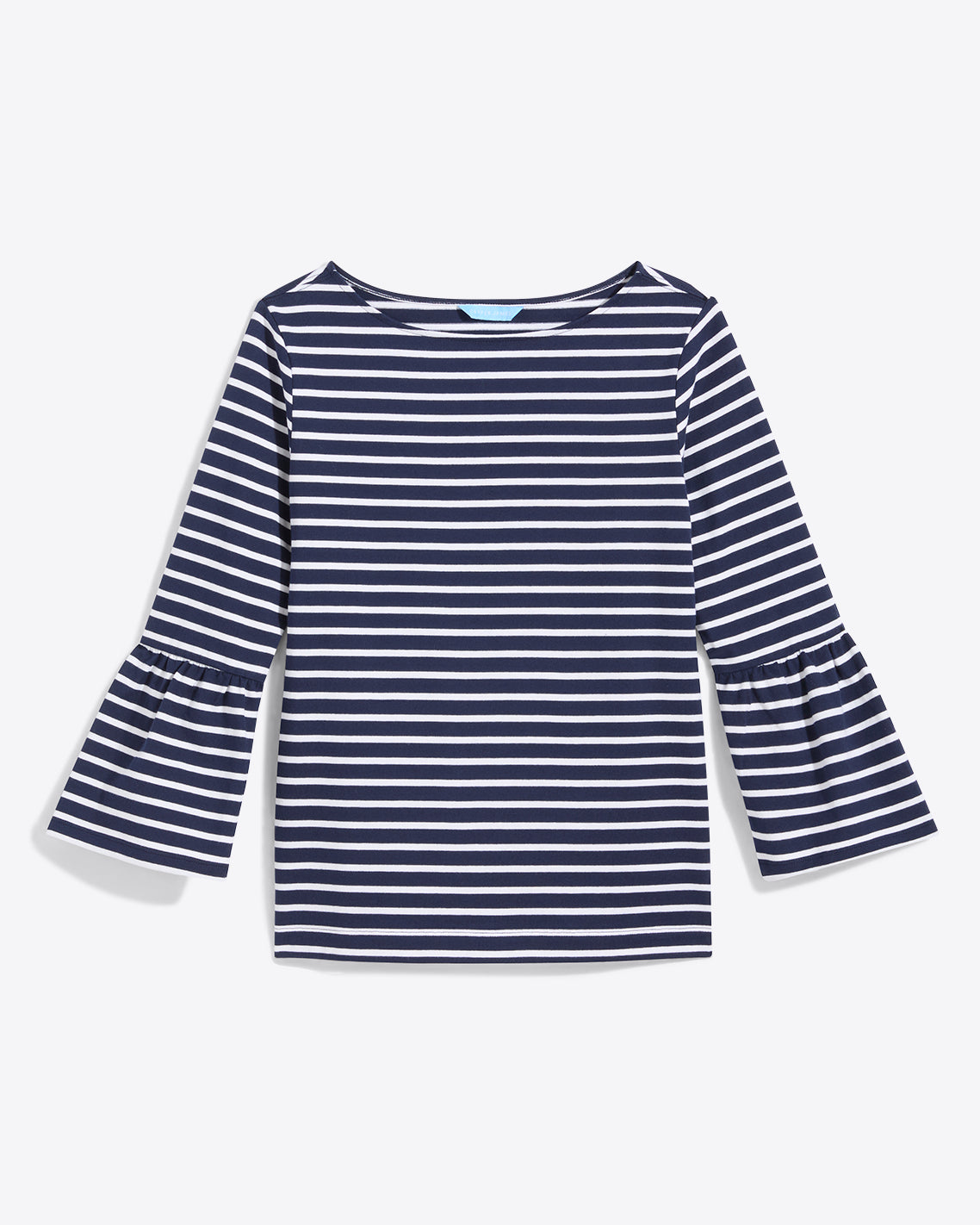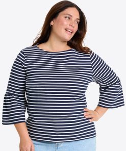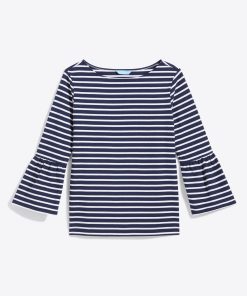 Ship shape. Our Corey Bell Sleeve Top is cut from soft 100% cotton jersey (in a cute nautical-inspired stripe) and finished with a boat neck and bell-shaped sleeves, for a look that’s the perfect mix of polished and laid-back. It’ll pair perfectly with your favorite jeans and a pair of sneakers.