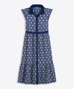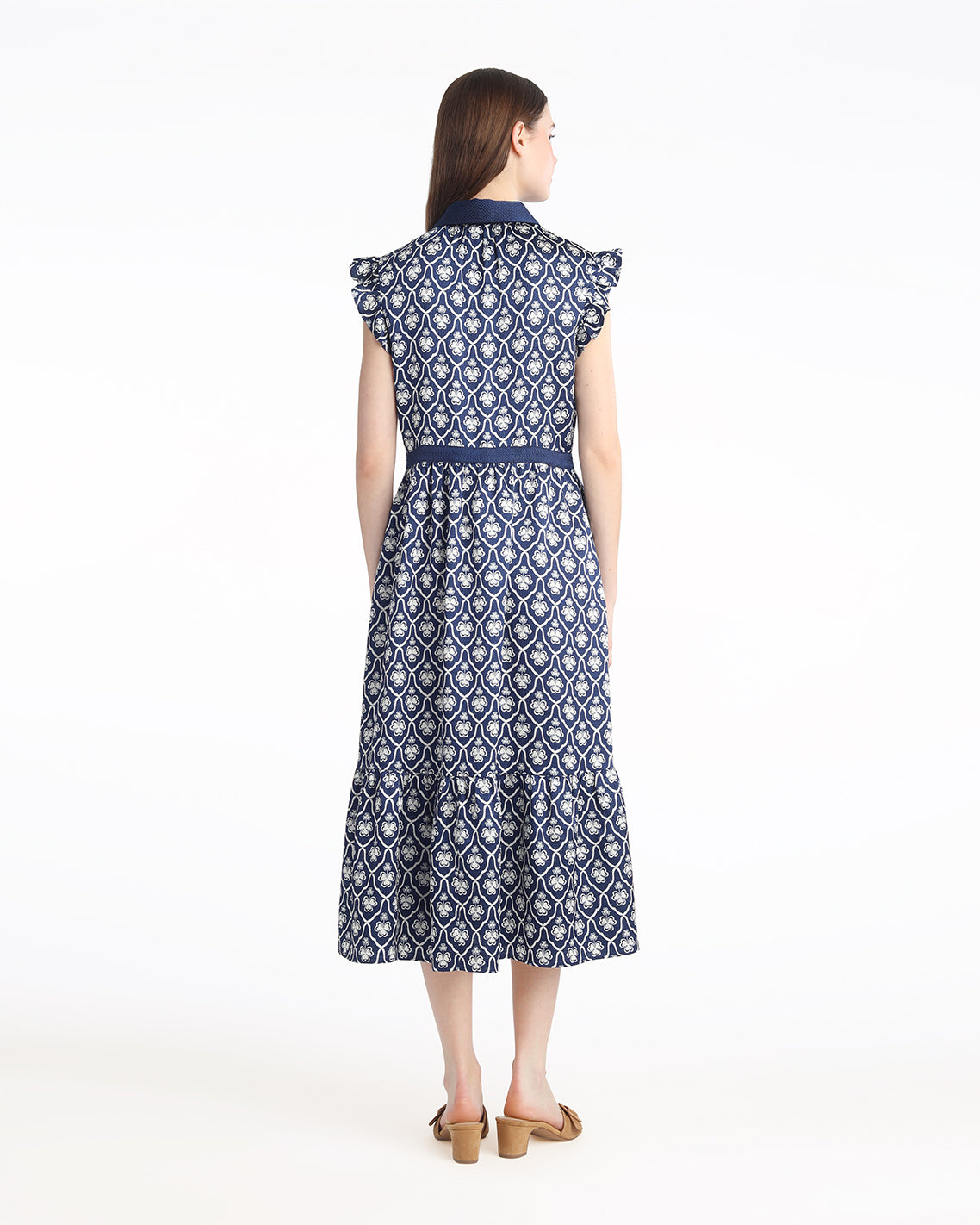 Button things up. Cut from printed hammered satin and finished with a contrasting collar and trim, our Emmylou Sleeveless Midi Shirtdress in Clover Field is a perfect, polished option for whatever you’re up to this season, from work meetings to weekend parties.