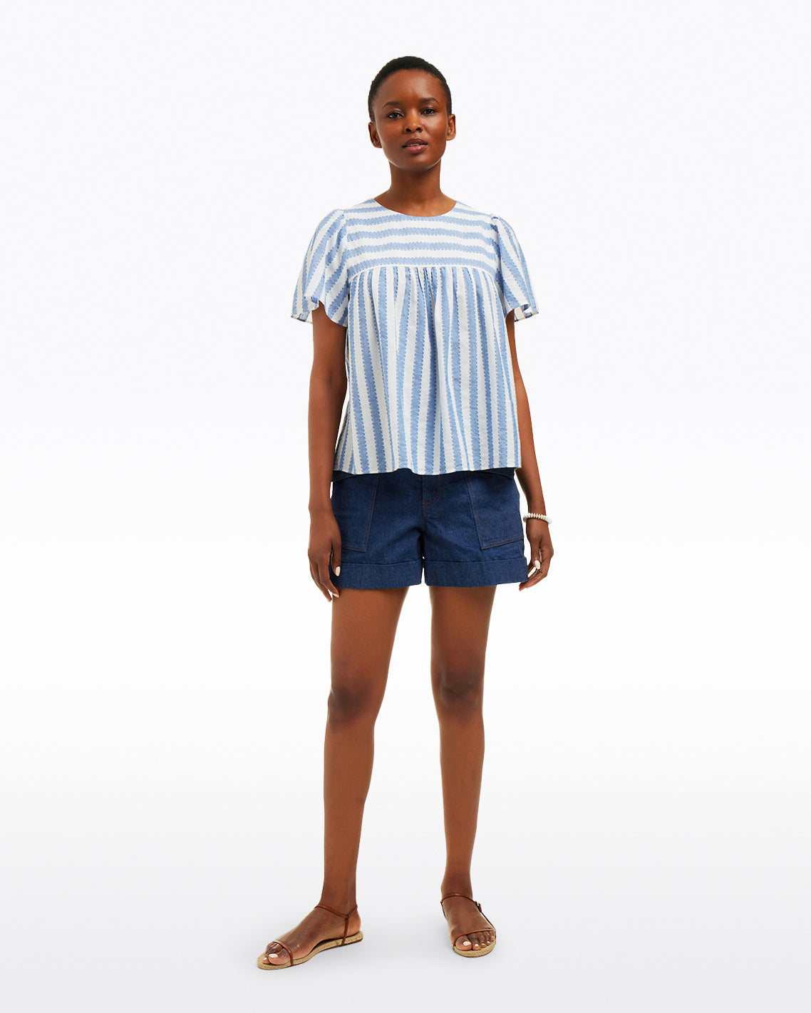 Breezy does it. Our Flutter Sleeve Top in Wave Stripe is made from 100% cotton with an airy, swingy silhouette that’s perfect for the hottest days of spring and summer. Wear it with your favorite jeans or jean shorts (maybe our Welt Pocket Shorts?) and sandals for an easy-but-polished ensemble.