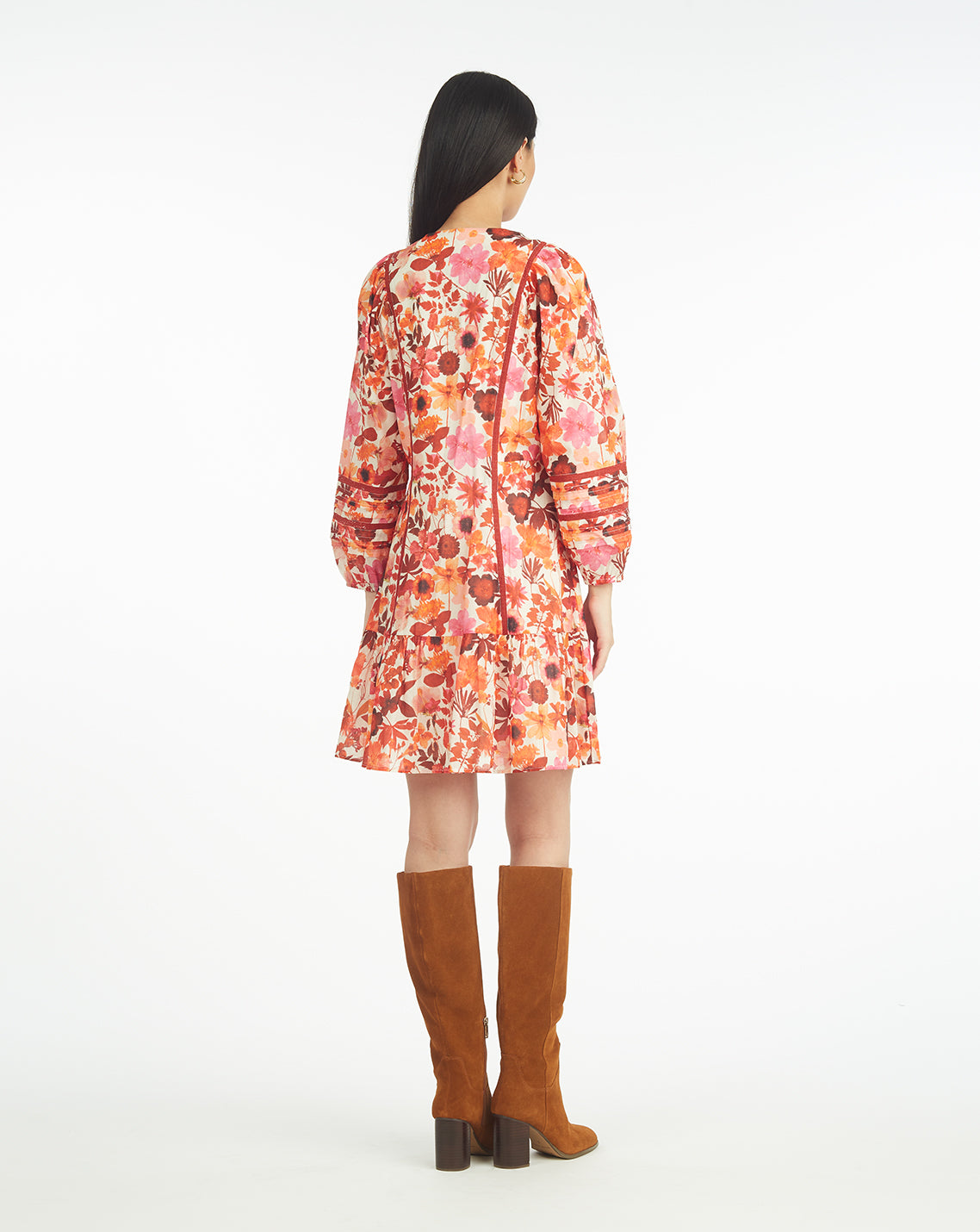 Meet the Gwen Dress—crafted in airy gauzy cotton and blooming with vibrant florals, it’s the kind of piece that turns heads and lifts moods. Thoughtful piping details frame the silhouette, while the tiered skirt and gently puffed sleeves bring easy movement and feminine flair. Fully lined for comfort, this dress feels as good as it looks—ready for garden parties, daytime strolls, or any moment that calls for something sweet and standout.