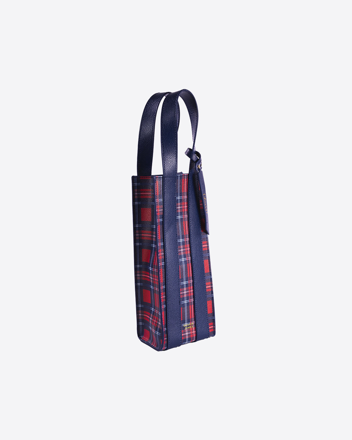 Hello, hostess gift! This single-bottle wine tote is made from a luxe pebbled leatherette patterned with the classic Angie Plaid pattern, has a smooth suede lining, and a cheeky “cheers” ribbon tag. Pair with your favorite bottle of red or white for the perfect gift!