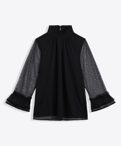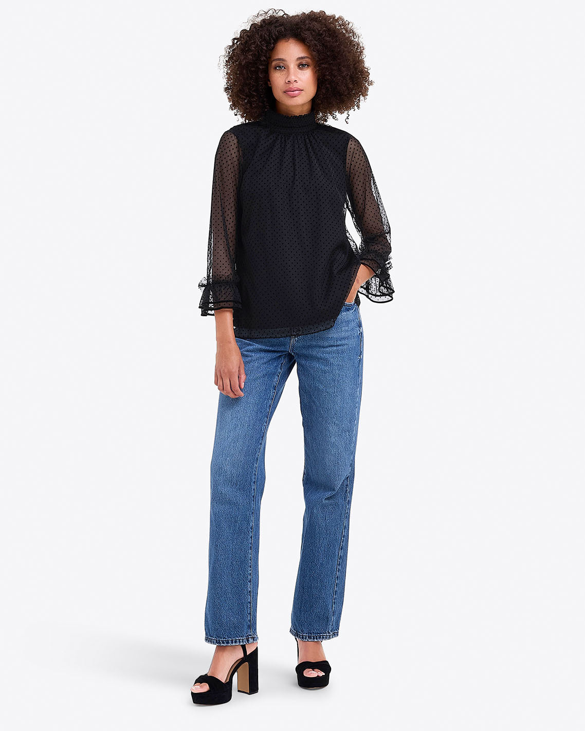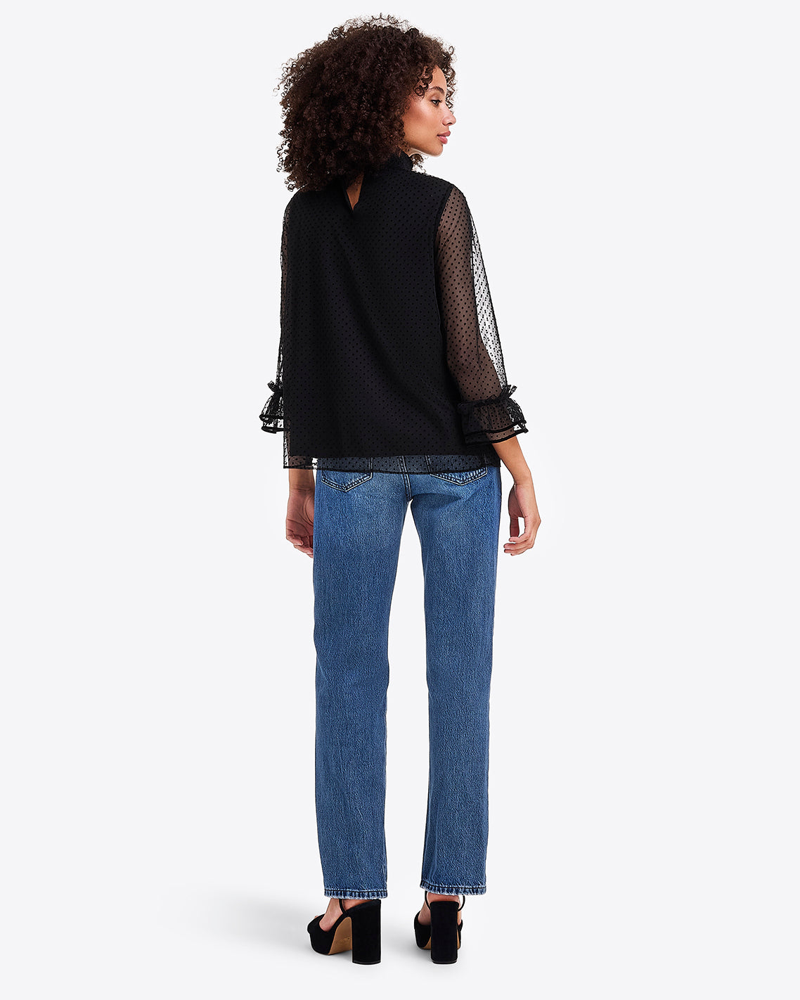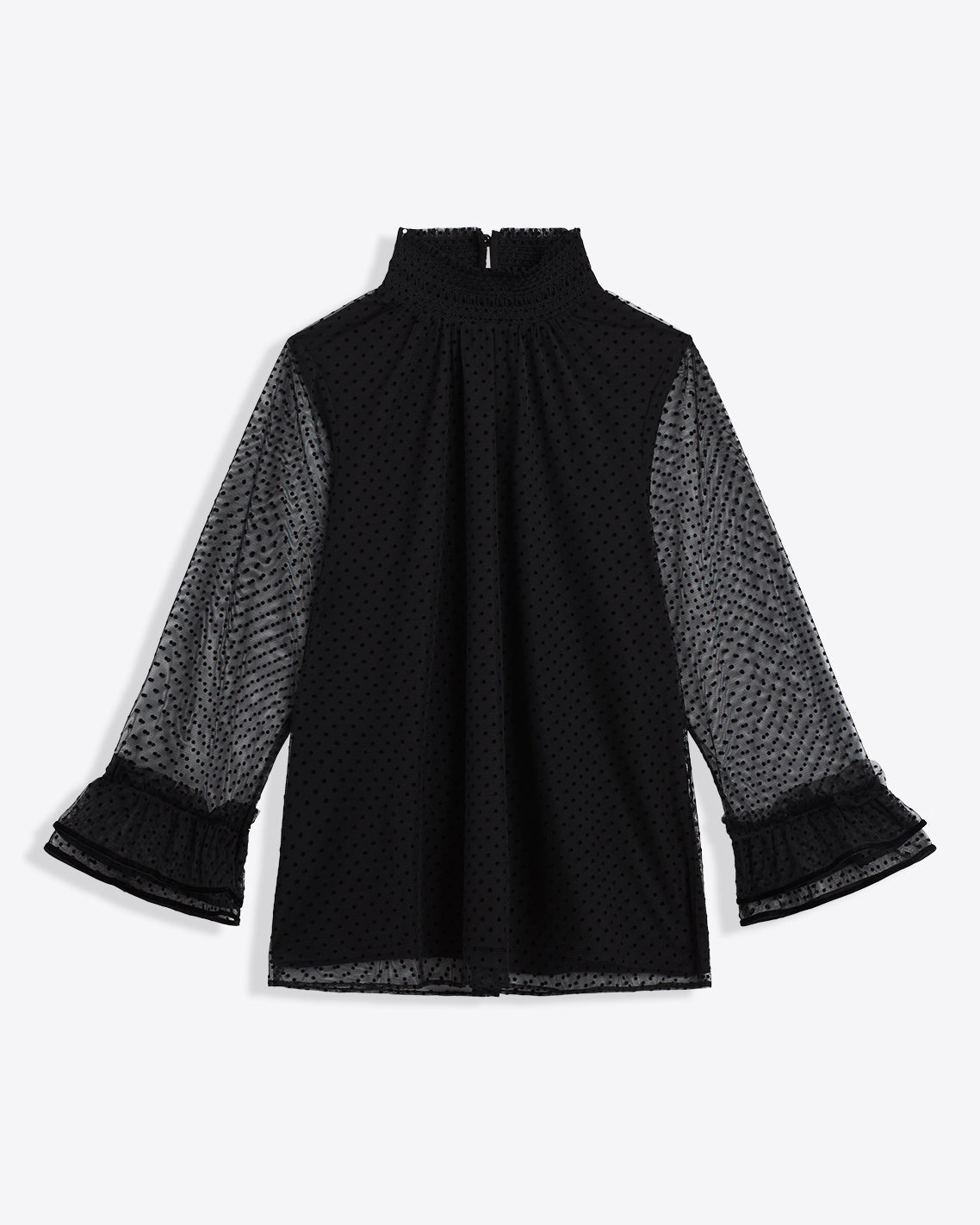 Top this. Our newest Ingrid Top features all of the style’s signature flourishes (including ruffles at the mock neck and cuffs) but it’s cut from a polka-dotted tulle, for a decidedly party-ready vibe. Pair it with your favorite jeans or pants for your next night out!