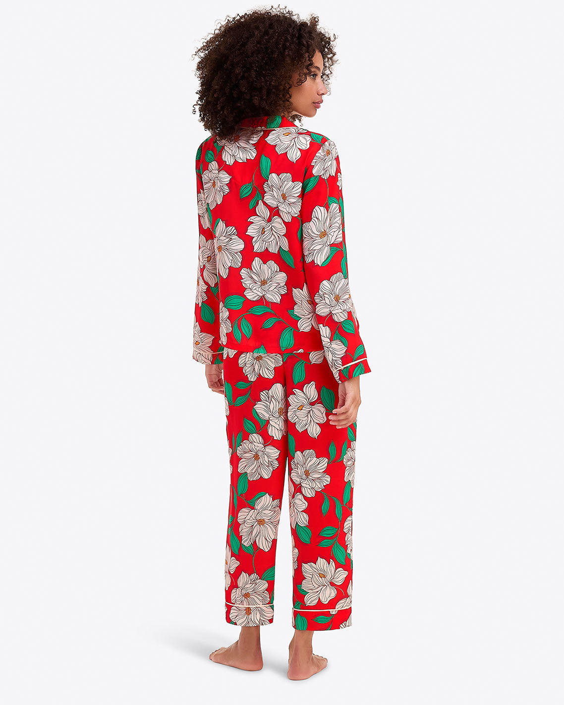 Good in bed. Our Long Sleeve Pajama Set is cut from a silky satin with a bold floral print, so it’s chic (and comfy) enough to wear all morning.