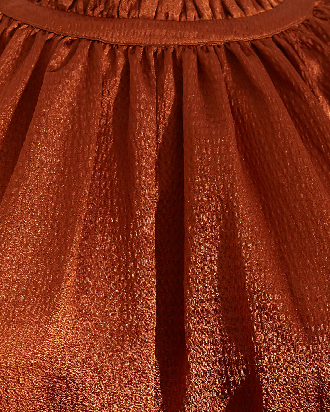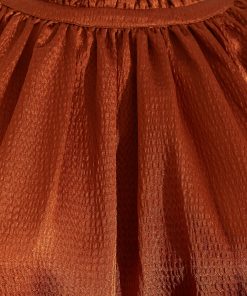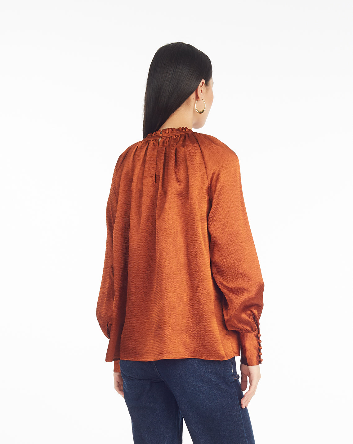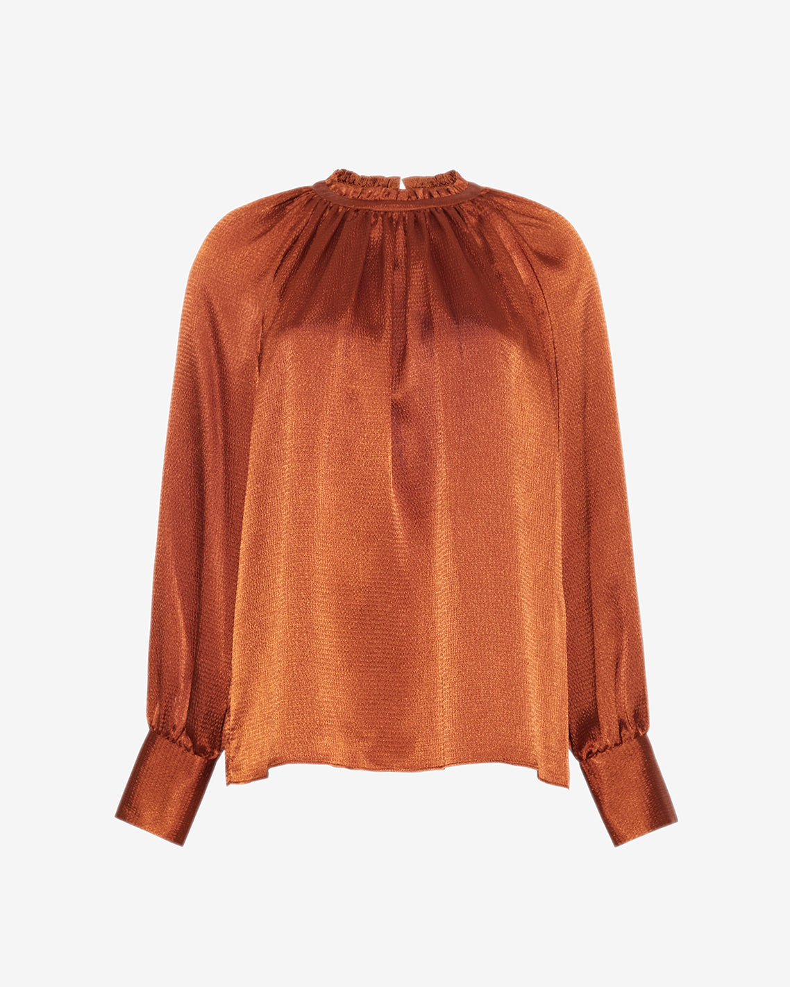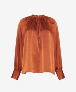 Our hammered satin blouse is all about understated drama. Designed with a gathered crewneck, graceful drape, and softly bloused sleeves finished with covered buttons, it’s the kind of top that makes even denim feel dressy. The rich rust hue gives it warmth and depth—perfect for fall and holiday, but equally striking year-round. Style it tucked, half-tucked, or loose—it’s polished no matter what.