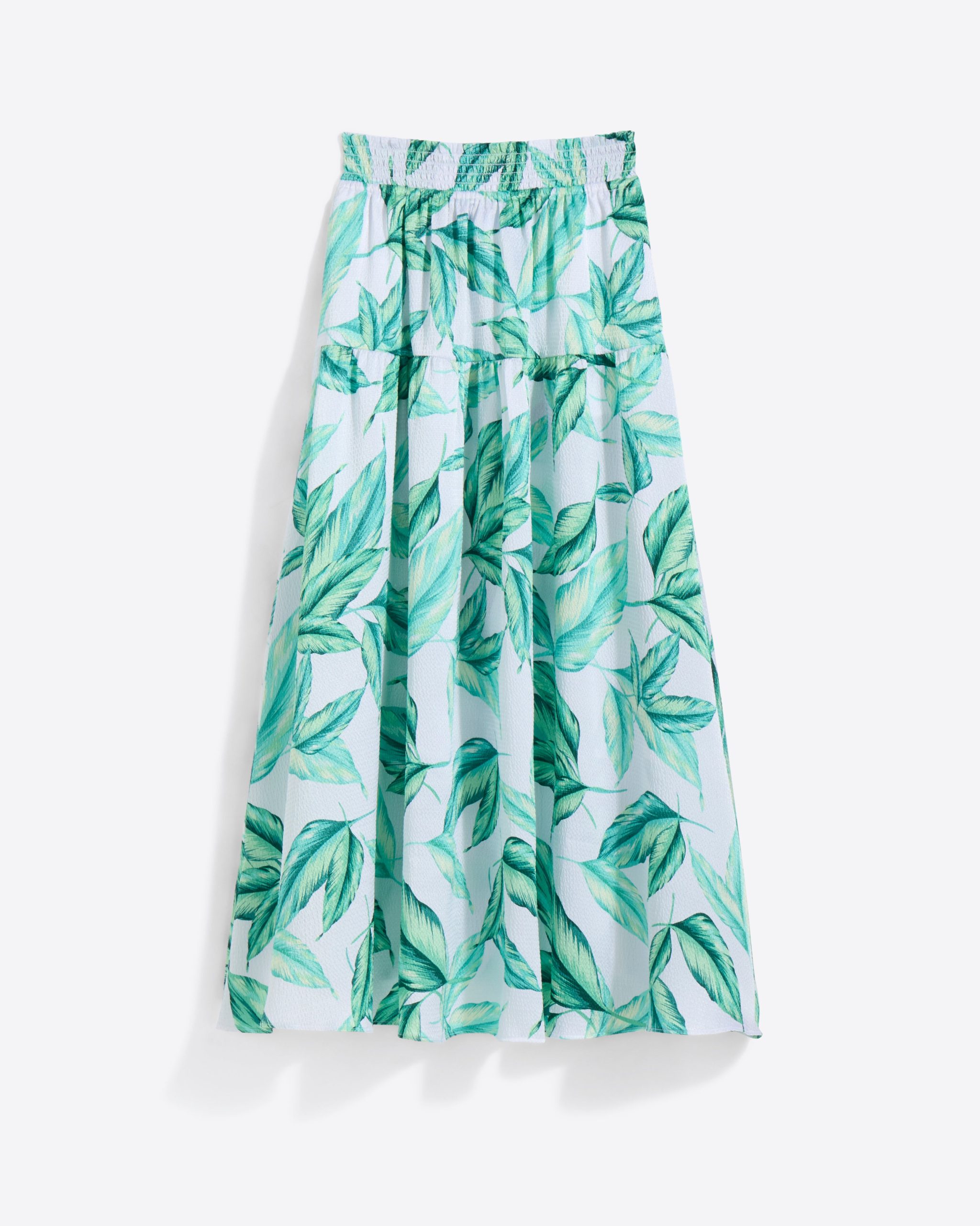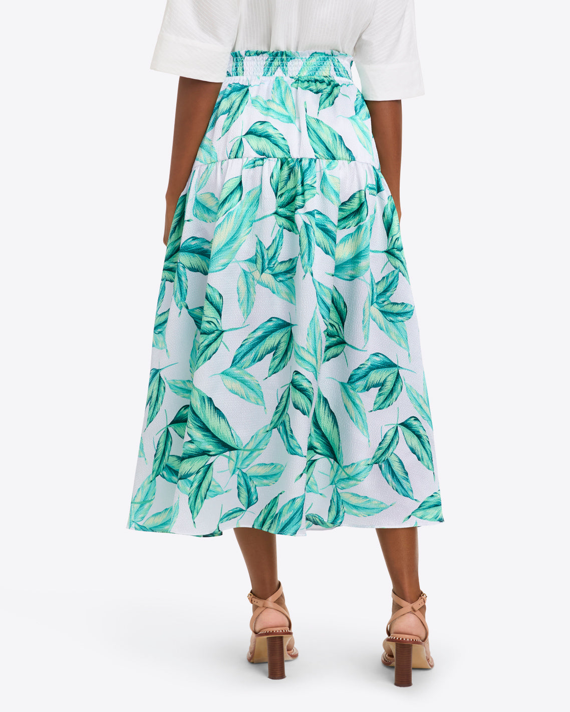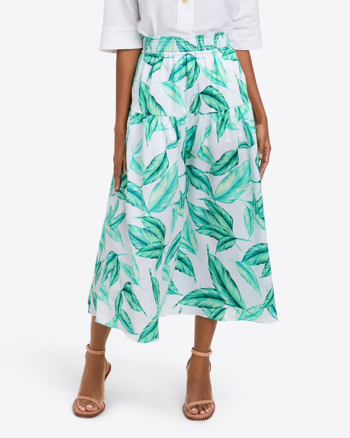 Skirt the issue. Our Midi Skirt, cut from a pretty leaf-printed hammered satin and finished with a comfortable smocked waist and practical on-seam pockets, is a perfect partner for everything from button-ups to tank tops to T-shirts.