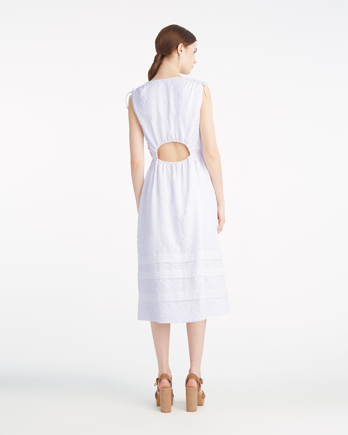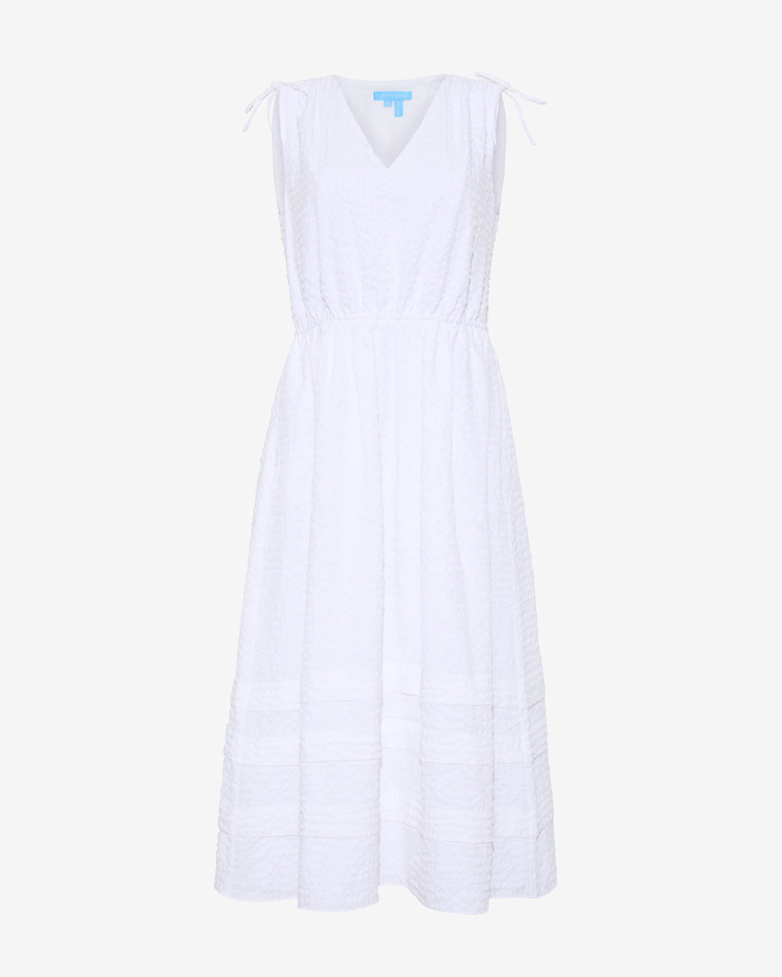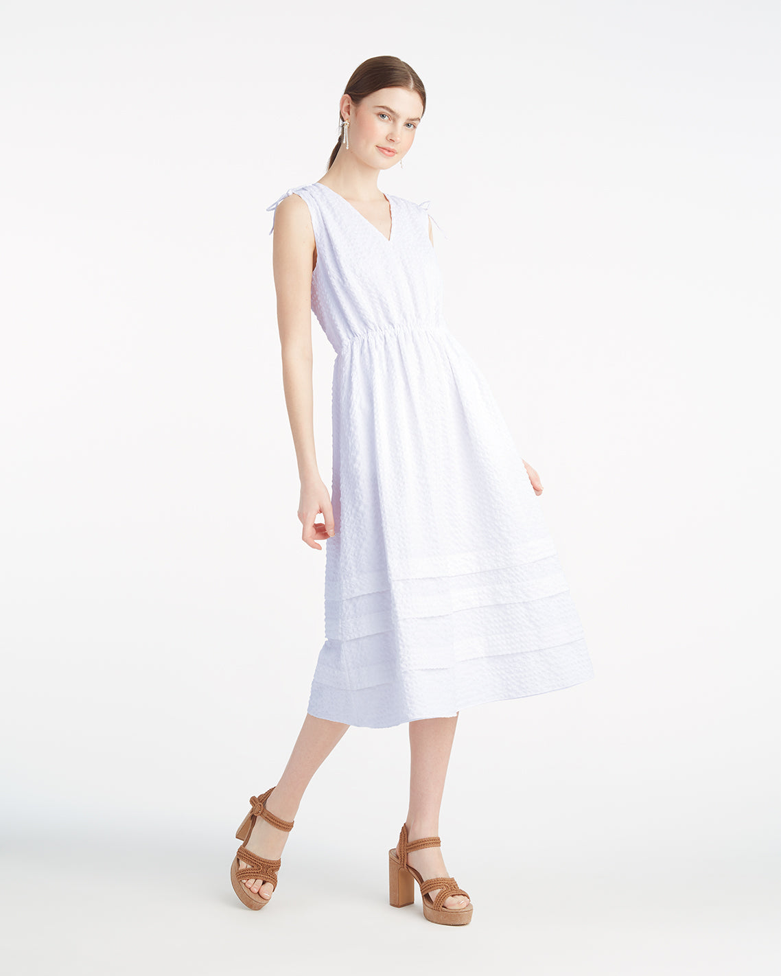 Save your tiers. Our Rowan Midi Dress in Seersucker is finished with cute details, including self-tying drawcords at the shoulder, pockets and a tiered skirt. Wear it with sandals (high-heeled or flat) and a pair of hoop earrings to garden parties, barbecues, dinners and more!