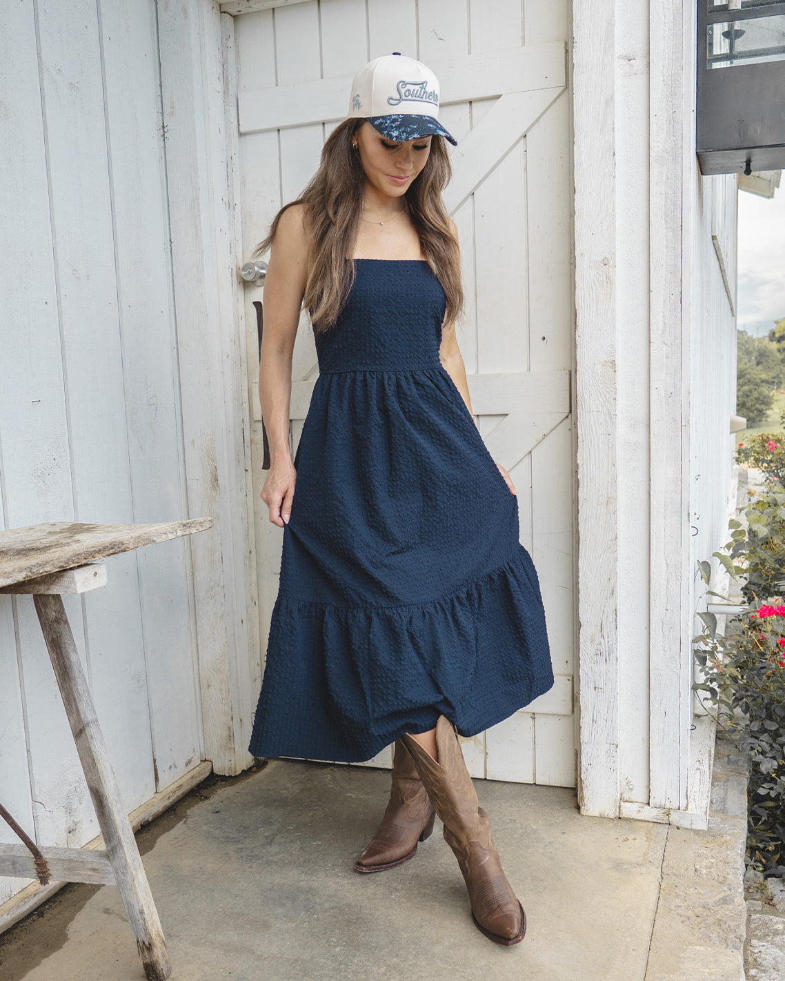 This exclusive snapback blends Southern charm with Western edge. Created in collaboration with Rustler Hat Co., the “Southern” hat features soft script embroidery, premium cotton twill, and a custom structured fit made for everyday wear. From tailgates to town squares, it tops off any outfit with effortless flair. Designed in Nashville and finished with signature Draper James detail, it’s where heritage meets modern style.