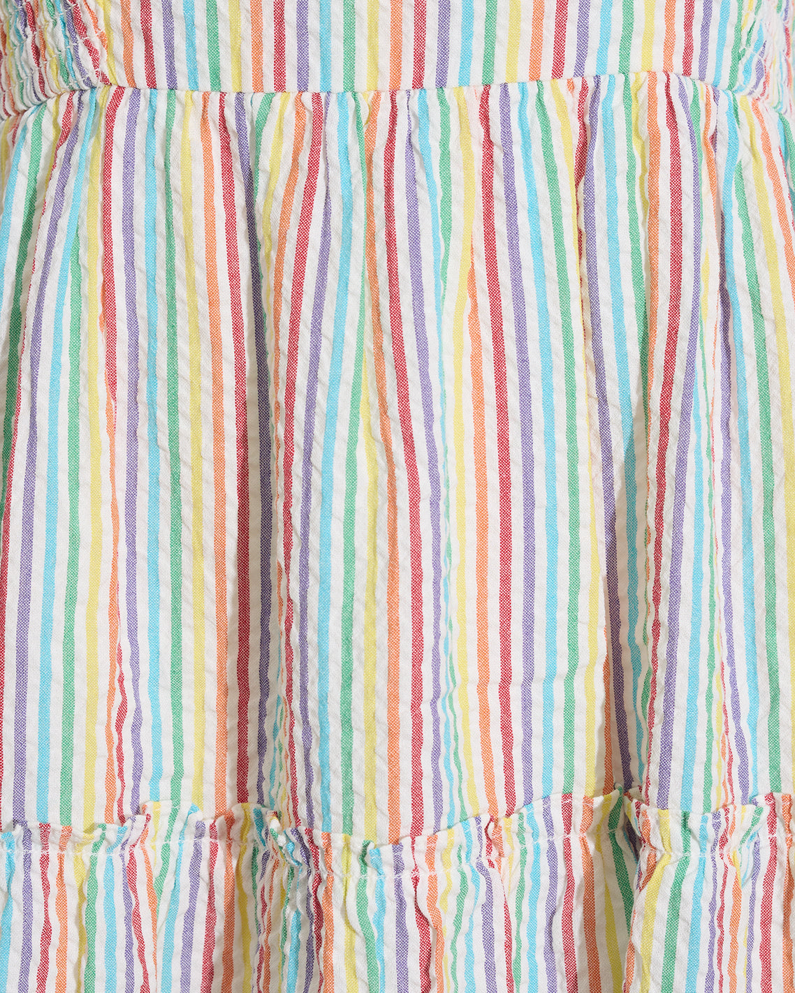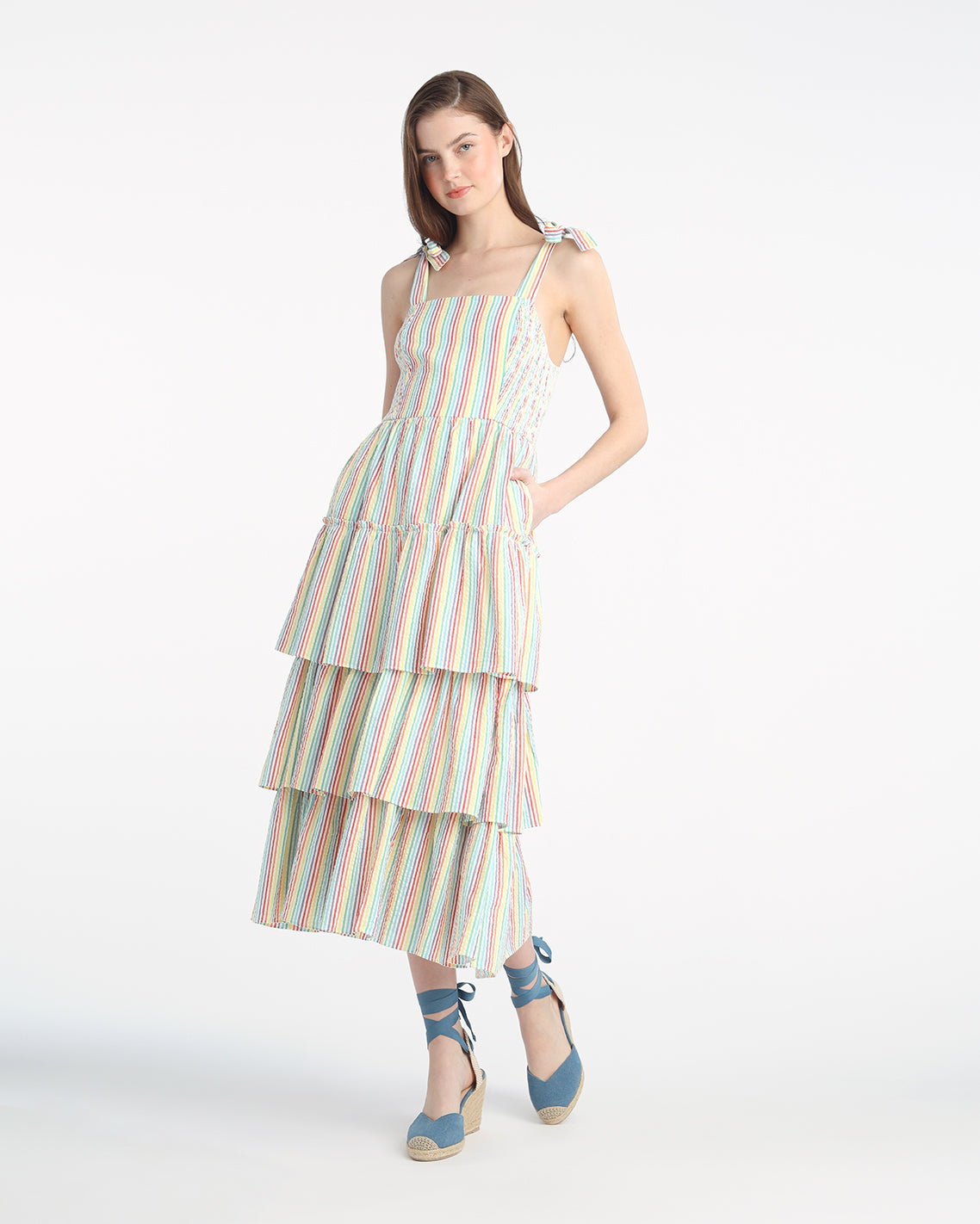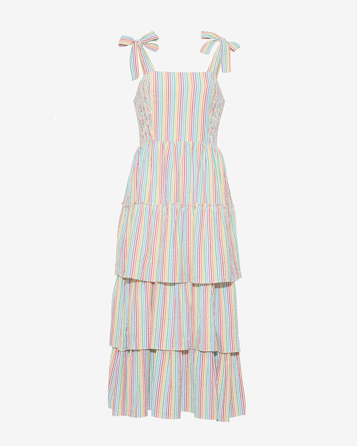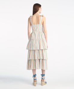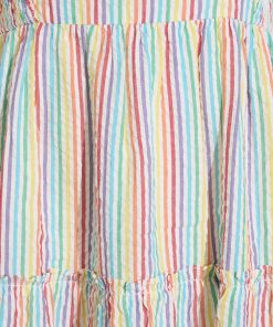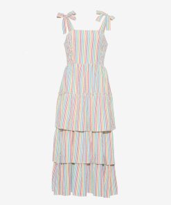 Chase rainbows. Our Taylor Tiered Midi Dress in Rainbow Stripe is made from brightly colored 100% cotton and finished with whimsical-yet-flattering details like self-tie shoulder straps and smocked side panels. Wear it with a pair of slip-on sneakers for day, and upgrade to high-heeled sandals for night.